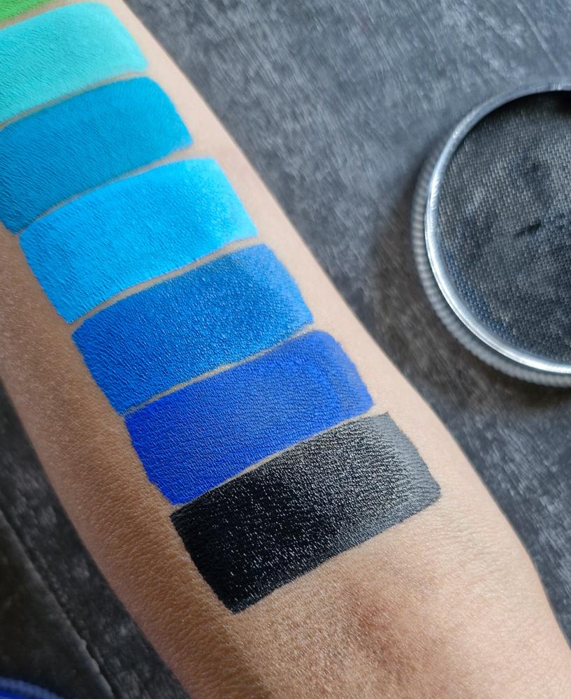 Черная краска фирмы MAG  имеет легкую текстуру, она ровно ложится на поверхность кожи, не полосит и не трескается. Черный регулярный цвет считается основным, он просто необходим в аквагриме. Его часто используют для обводки рисунков  в аквагриме, создания объема и детализации. Краски активируются водой, наносятся губкой или кистью.