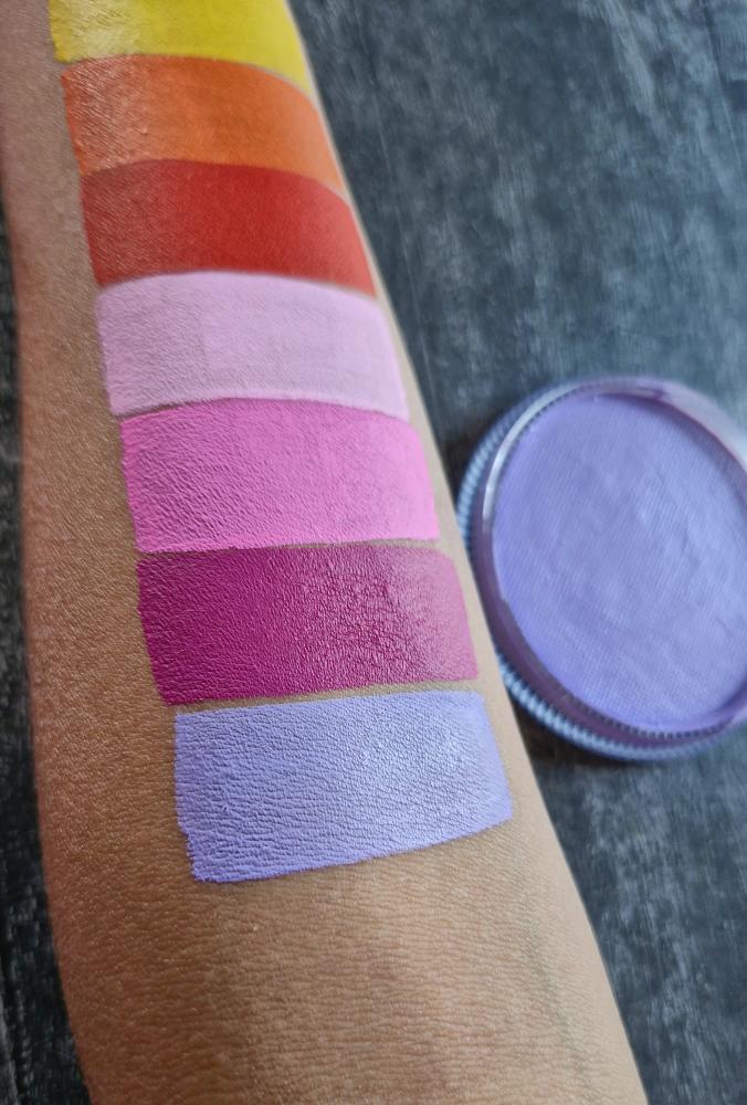 Светло-фиолетовая высокопигментированная краска для лица и тела (аквагрим) фирмы MAG для лица и тела  имеет мягкую текстуру за счет косметического воска в составе, ровно ложится на поверхность кожи, не полосит, не трескается и не осыпается. Этот регулярный цвет очень нежный, подходит для свежих воздушных  образов! Идеален для фона. Часто используют в радужках в сочетании с неоном маджента или фиолетовым.