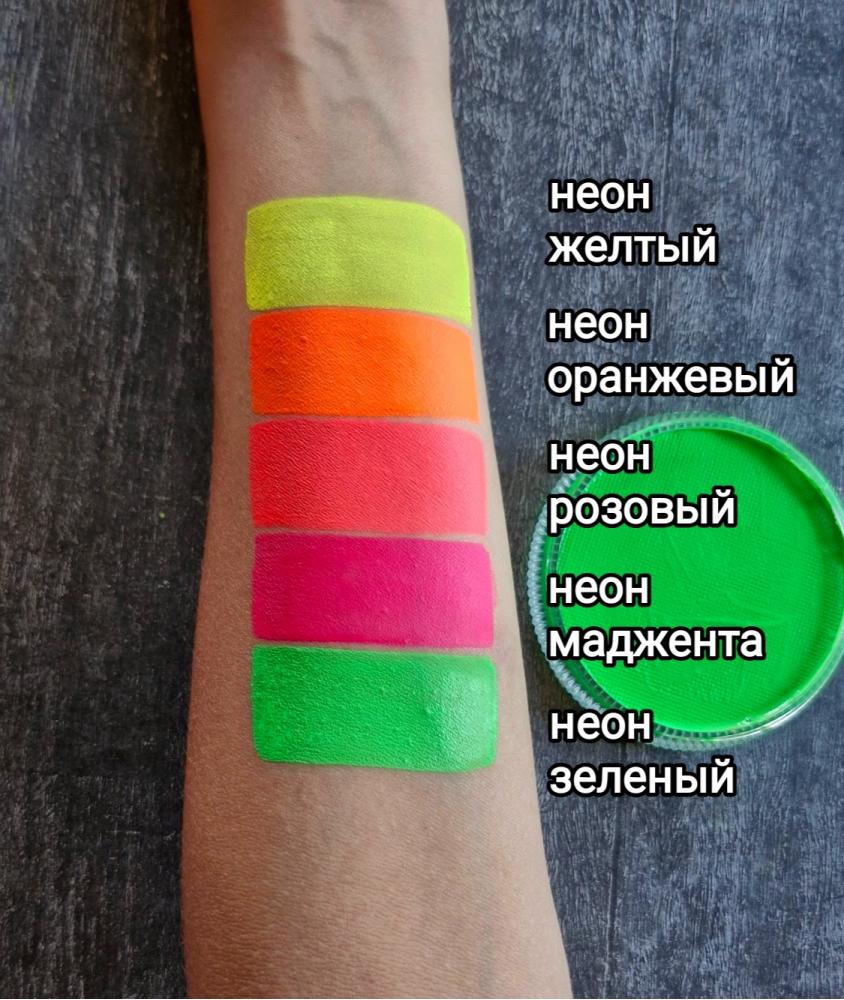 Неоны не оставляют следов на коже! Его часто используют для рисунков летних сочных образов и нежных фоном для девочек. Краски активируются водой, наносятся губкой или кистью.