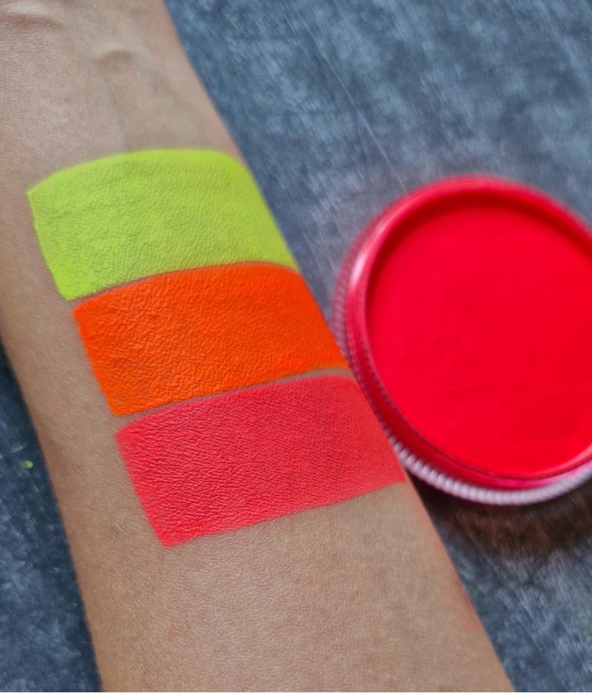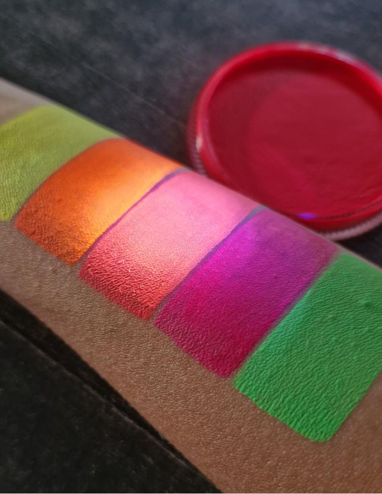 Неоновые цвета ярче, чем базовые из-за флуоресцентного пигмента, который содержится в них. Этот краситель светится при искусственном неоновом освещении или УФЛ, а так же при дневном освещении. Насыщенные, но не такие  плотные, хорошо ложатся на кожу, не трескаются после высыхания. Гипоаллергенные!