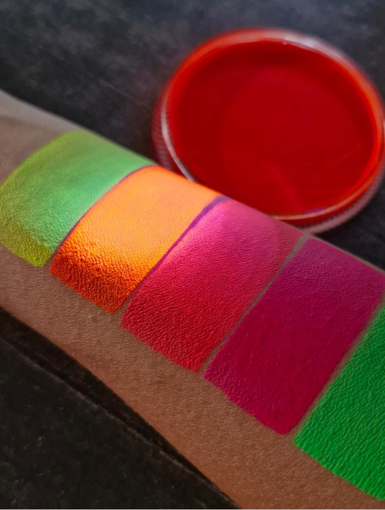 Неоновые цвета ярче, чем базовые из-за флуоресцентного пигмента, который содержится в них. Этот краситель светится при искусственном неоновом освещении или УФЛ, а так же при дневном освещении. Насыщенные, но не такие  плотные, хорошо ложатся на кожу, не трескаются после высыхания. Гипоаллергенные!