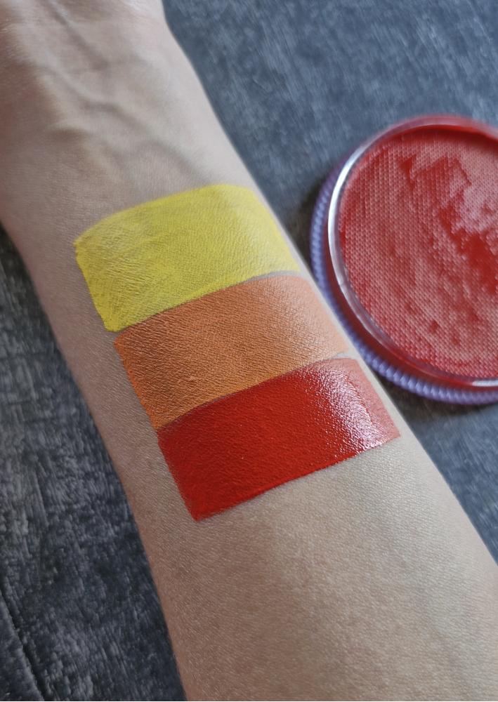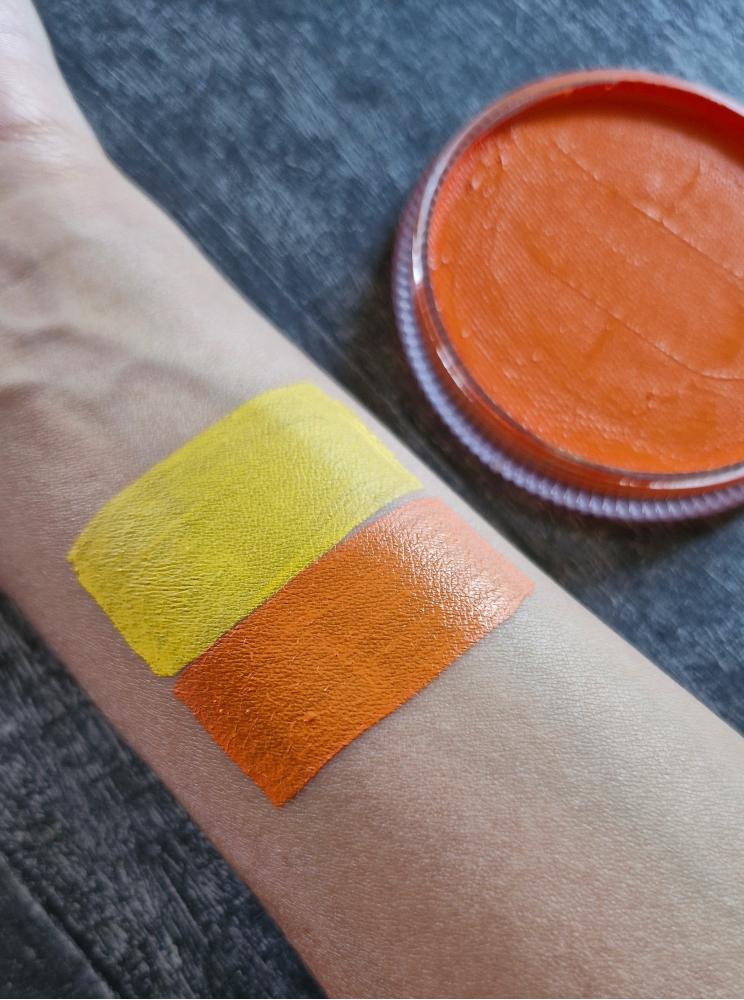 Оранжевая высокопигментированная краска для лица и тела (аквагрим) фирмы MAG  имеет мягкую текстуру за счет косметического воска в составе, ровно ложится на поверхность кожи, не полосит, не трескается и не осыпается. Оранжевый регулярный цвет считается основным, используется в образах животных в аквагриме.