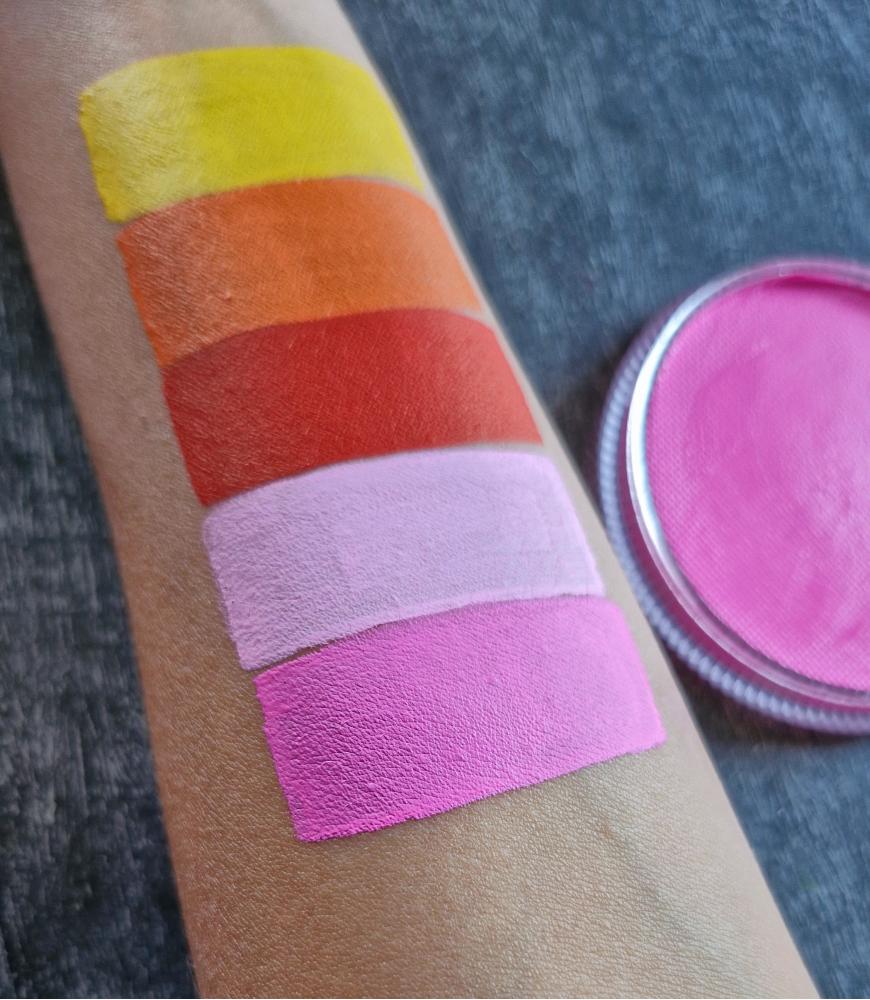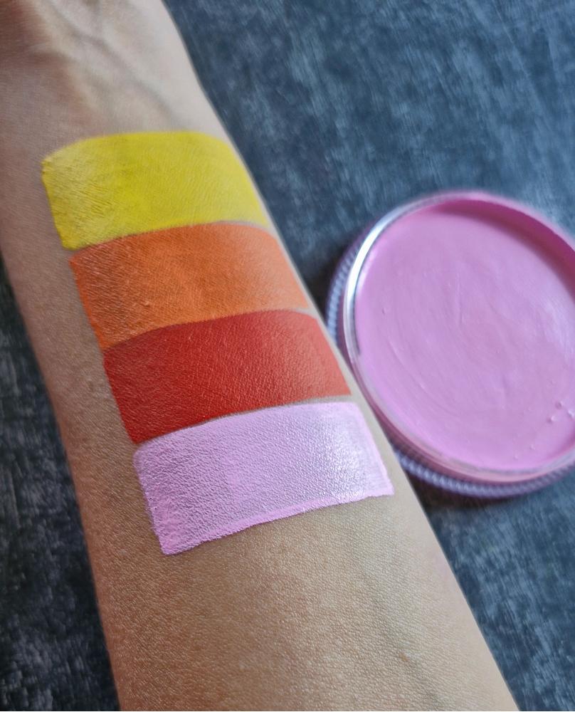 Светло-розовый высокопигментированная краска для лица и тела (аквагрим) фирмы MAG  имеет мягкую текстуру за счет косметического воска в составе, ровно ложится на поверхность кожи, не полосит, не трескается и не осыпается. Розовый аквагрим идеальное дополнение к фиолетовым и красным оттенкам. Часто используется для рисунков с элементами флоры, любимый оттенок аквагрима у девочек. Цвет светло-розовый или пинк канди или конфентый.