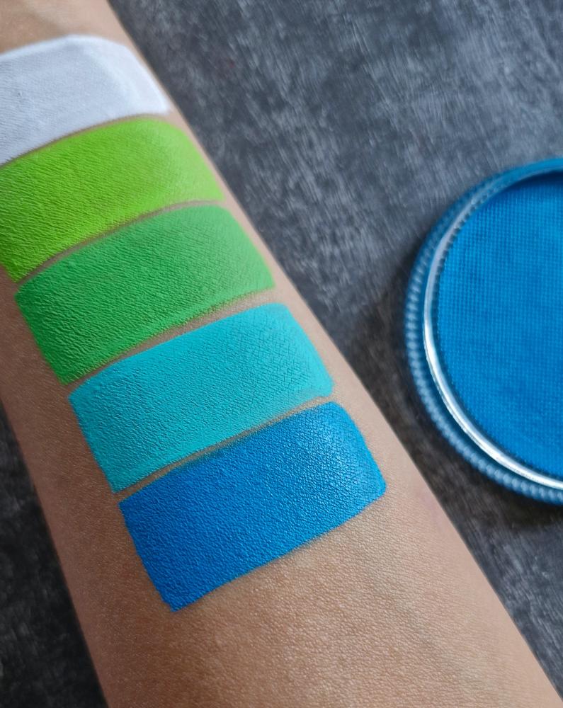 Темная бирюзовая высокопигментированная краска для лица и тела (аквагрим) фирмы MAG  имеет мягкую текстуру за счет косметического воска в составе, ровно ложится на поверхность кожи, не полосит, не трескается и не осыпается.  Цвет темный сине-зеленый, морской глубины. Идеален для рисунков с морской тематикой. Линии, точки, завитки и капли - одно из направлений в аквагриме. Этот оттенок бирюзы, уходящий в зеленый цвет.