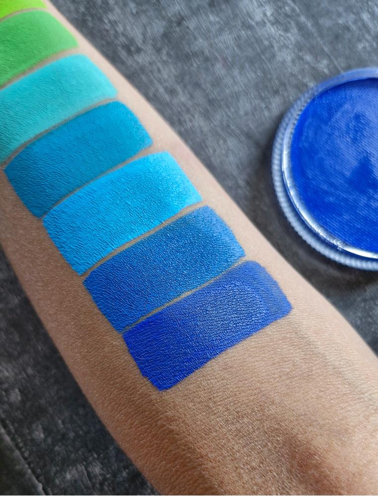 Яркий синий высокопигментированная краска для лица и тела (аквагрим) фирмы MAG  имеет мягкую текстуру, она ровно ложится на поверхность кожи, не полосит и не трескается. Синий регулярный цвет считается основным. Его часто используют для рисунков с образами героев и масок, а также для образов  с элементами морской тематики.